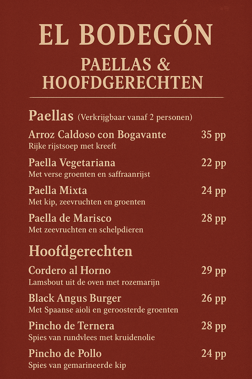 Bekijk hier onze menukaart de gerechten zullen maandelijks varieren en ontdek de heerlijke gerechten die El Bodegon te bieden heeft. Laat u verrassen door onze smaakvolle creaties, bereid met verse ingrediënten. Geniet van een culinaire reis vanuit het comfort van uw eigen huis. Of reserveer een tafel om de volledige El Bodegon ervaring in Zandvliet te beleven.